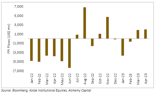 FPI flows were strong for a second consecutive month after >12m of sustained weakness. Flows in the derivative market were also robust in Apr-23. As interest rates peak, we expect a turnaround in FPI flows as the extreme risk aversion during rising rates starts to dissipate. However, in the absence of rate cuts in the near term (which is our base case), these flows should remain moderate and start to shoot up when rate cuts begin, probably in CY24.