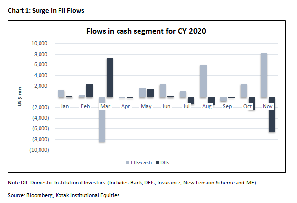 Global tailwinds : The positive outcome on the US elections has helped contain global risks. The accommodative stance of global central banks, mainly the Fed, is likely to continue until the growth damage from COVID is repaired. Moreover, there is a possibility that the Joe Biden administration could resort to a strong fiscal stimulus. The stage looks set for favourable conditions for across the world, including emerging market equities. India is likely to continue to benefit from that scenario, as was evident from the $9.37bn FPI inflows in November, up ~5x m/m.
